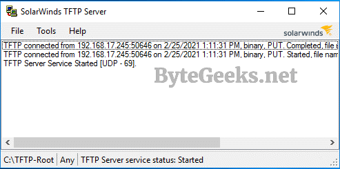 The configuration of solarwinds tftp server is pretty straight forward. Leaving everything to default should work. To open the configuration window, click on Files > Configure.